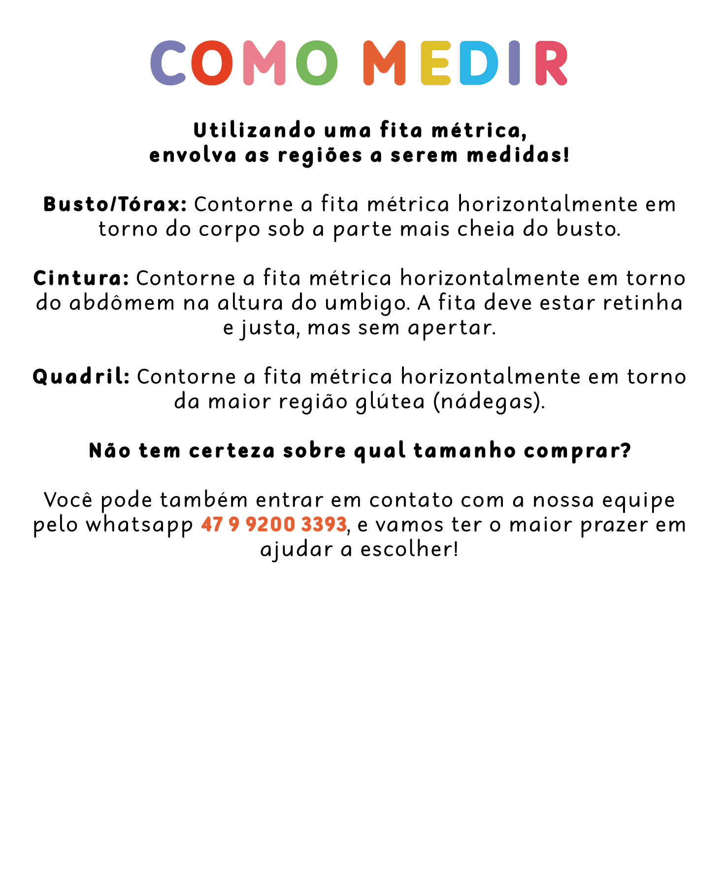 Sabemos que há uma grande variação de peso e tamanho entre as crianças da mesma idade. Nossa modelagem é mais "certinha", os tamanhos normalmente correspondem com a idade que a criança está. Geralmente as mães costumam comprar um tamanho maior para que as crianças usem as nossas peças por mais tempo.
